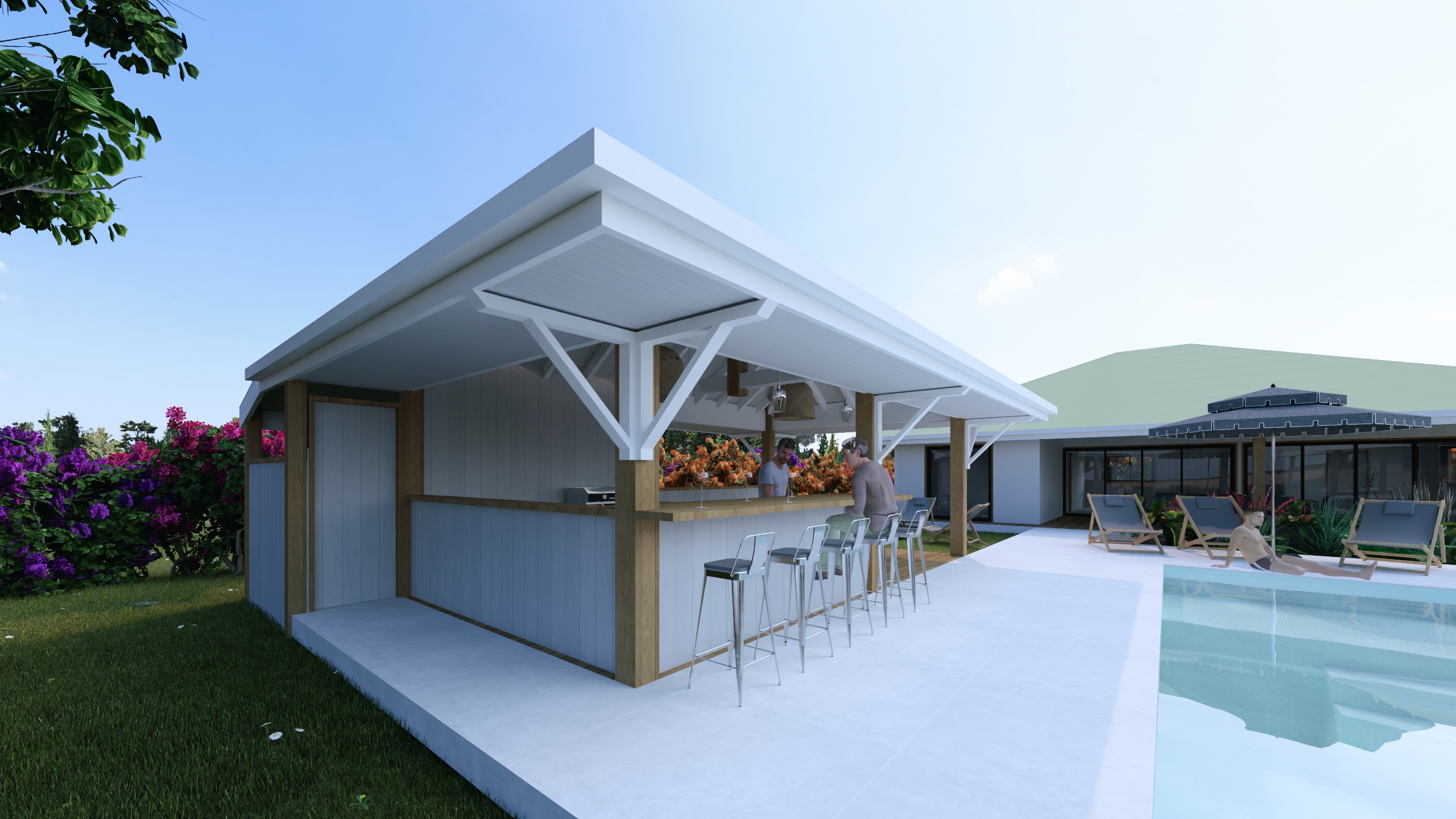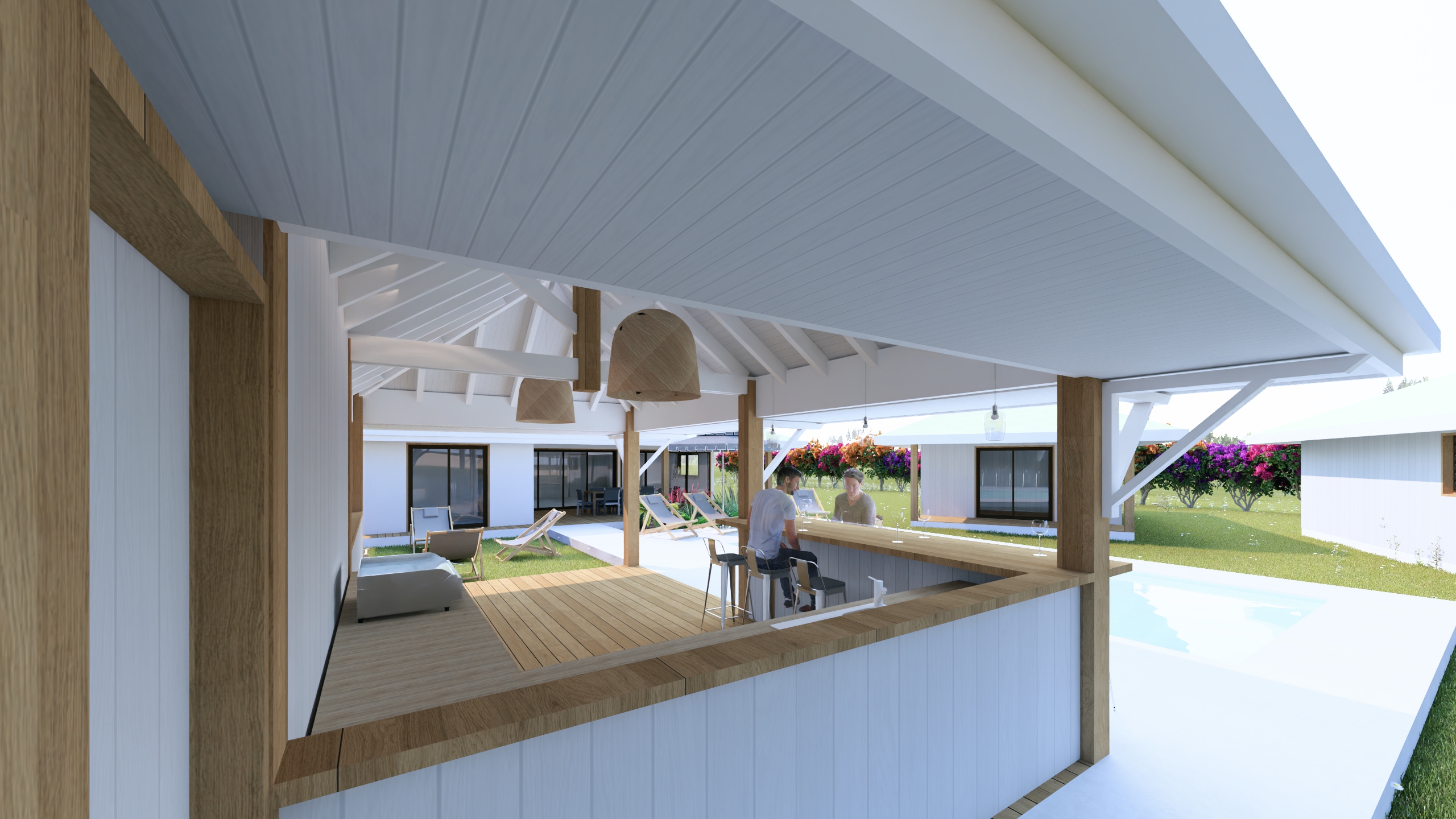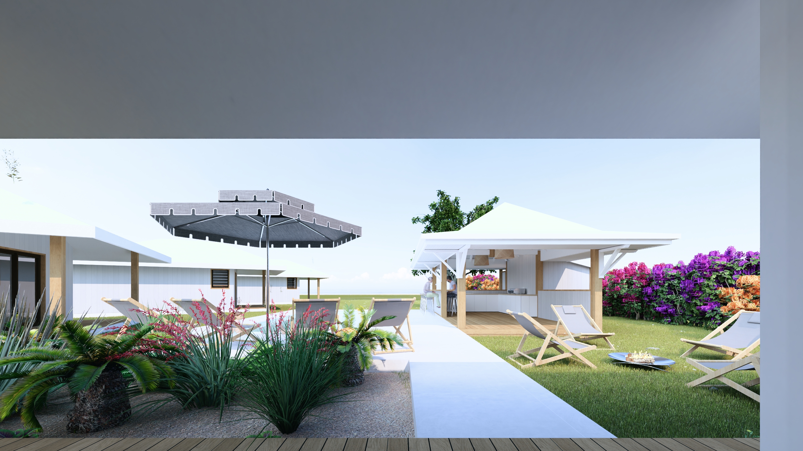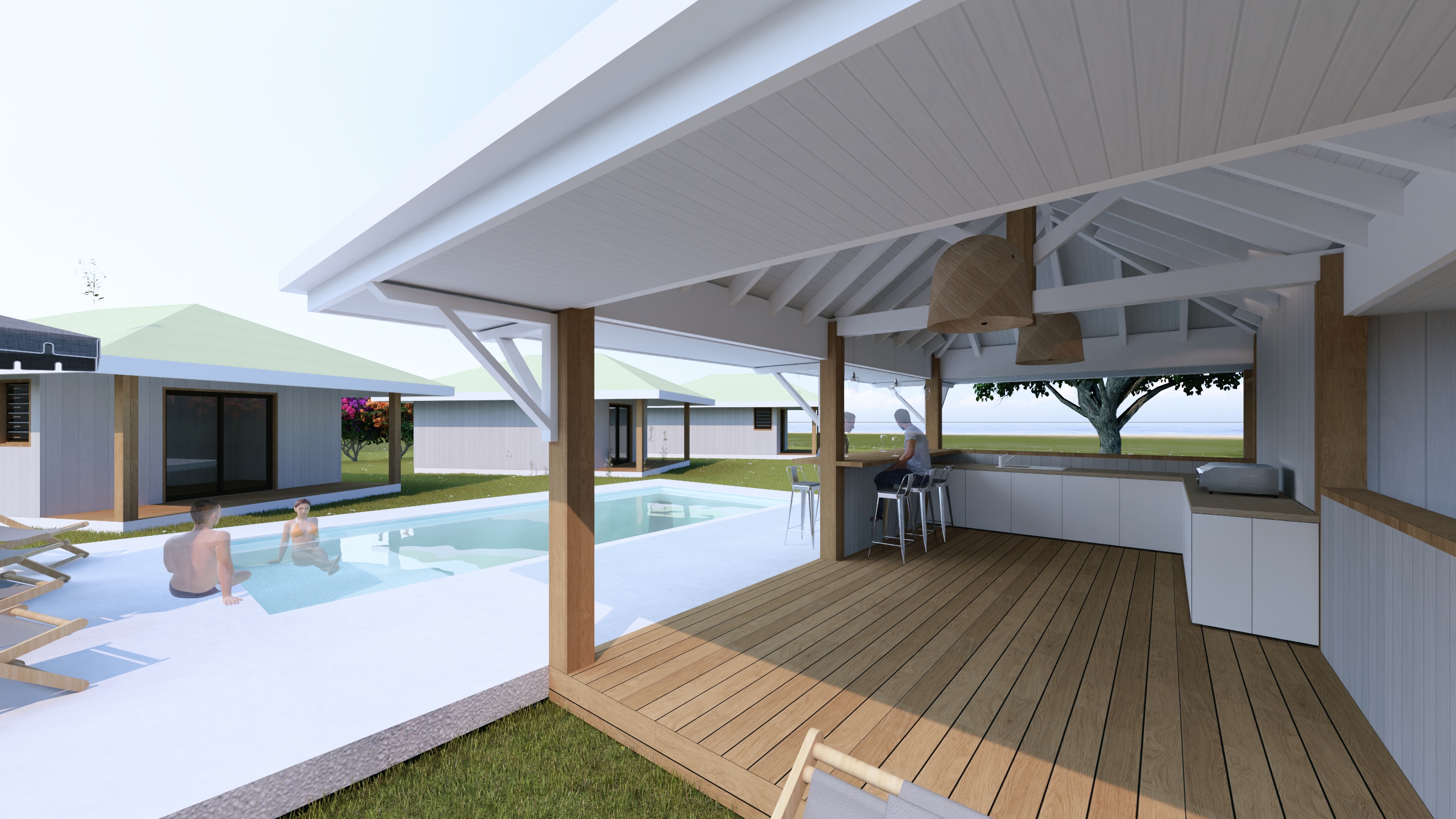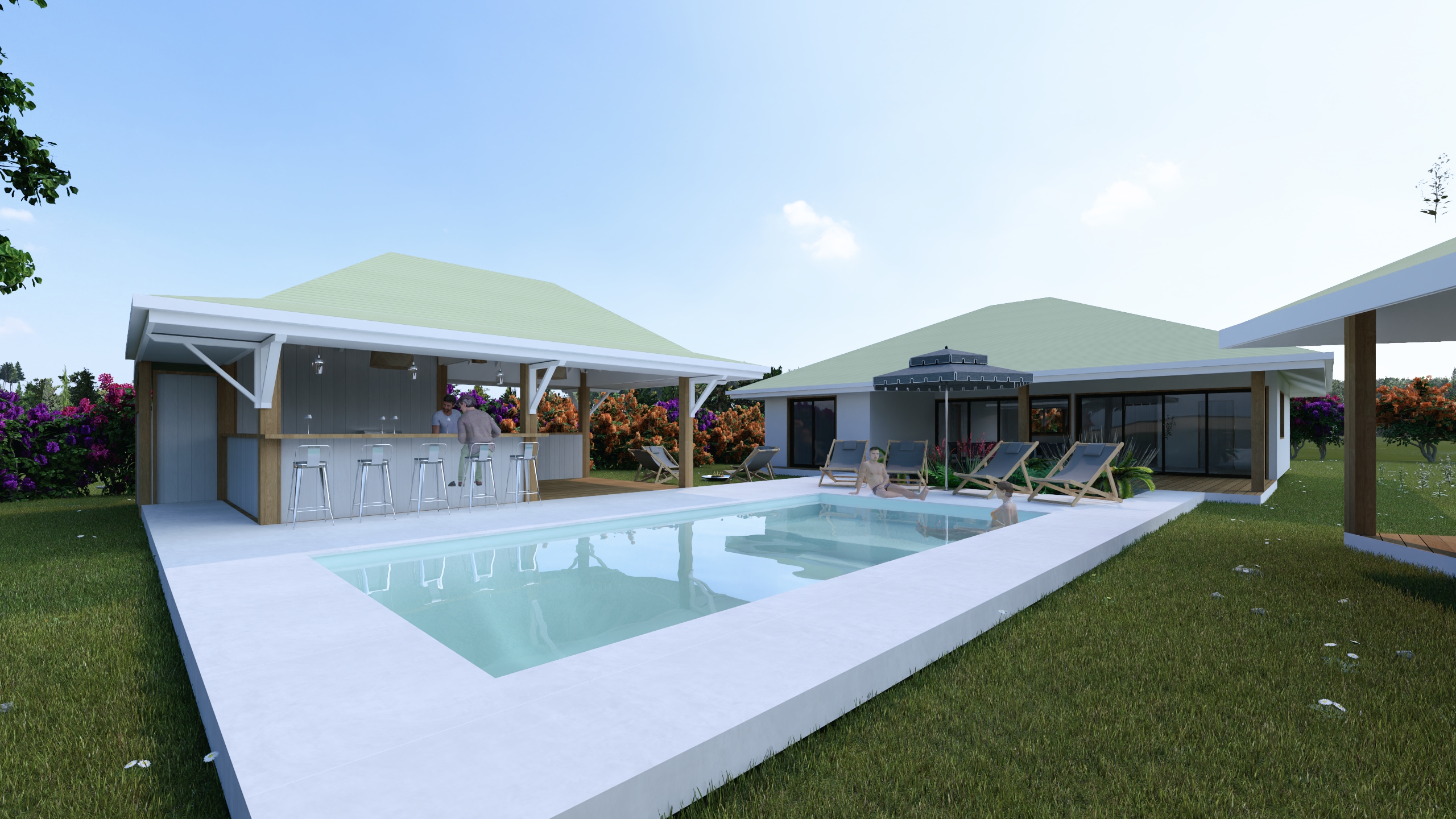 Aménagement d’un espace de vie extérieur, piscine et faré